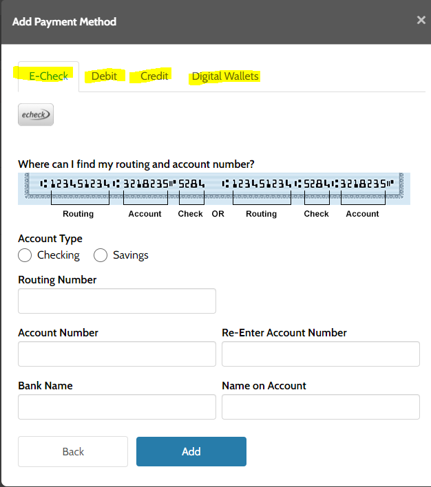 - eCheck: ; Checking and Savings Account (Savings depending on bank)